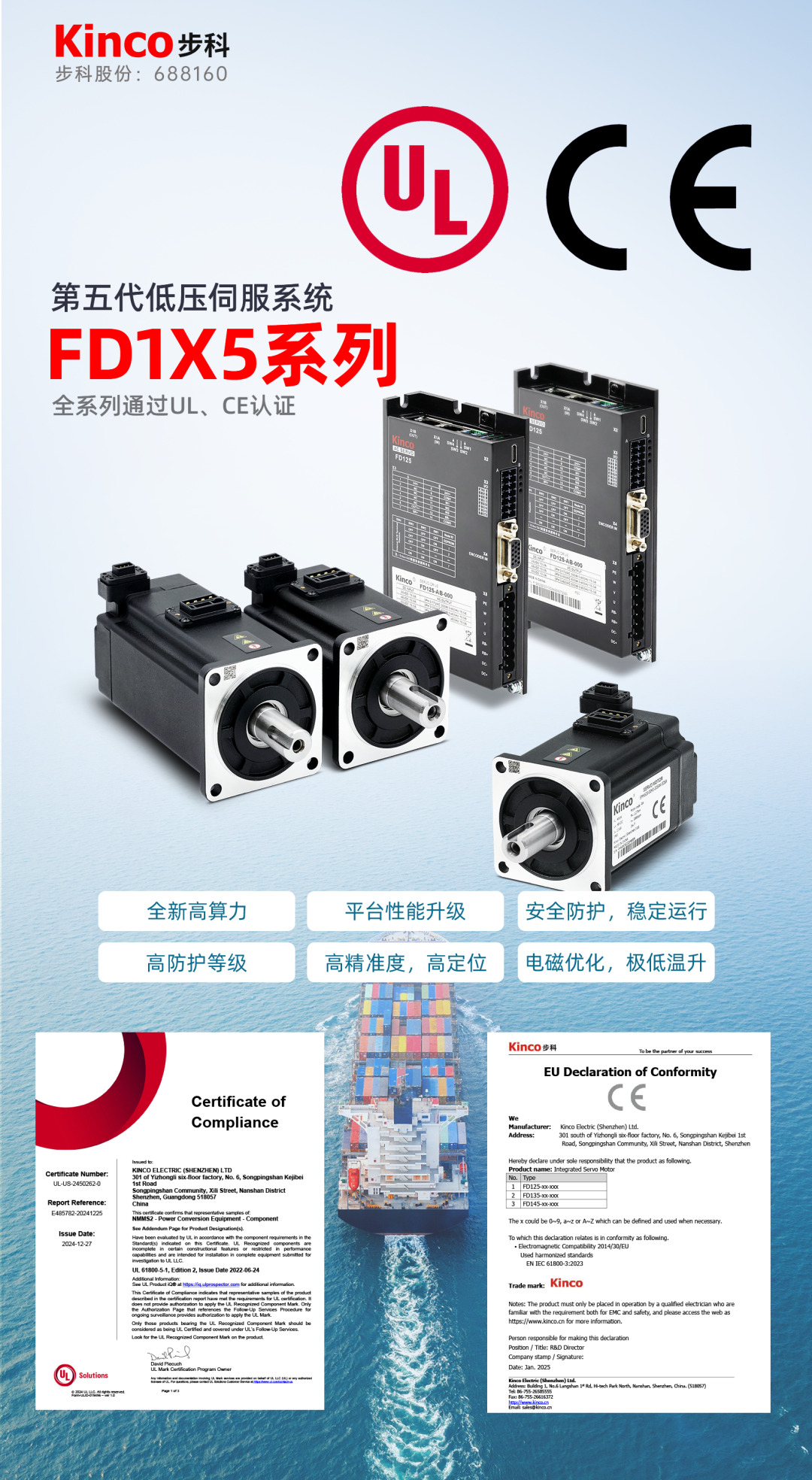 步科FD1X5系列低压伺服系统凭借着技术创新和可靠品质,全系列通过UL与CE认证,标志着产品在电气安全、稳定性和环境适应性均达到国际一流水准,助力客户无缝对接海外严苛的法规要求,缩短认证周期,降低市场准入成本。